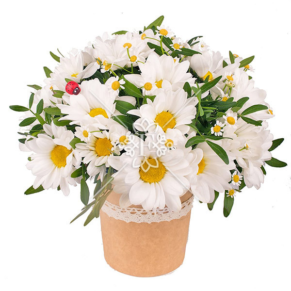 Выбирая подарок, обратите свое внимание на чудесную композицию «Первое признание». Нежность и воздушность в каждом лепестке белоснежных кустовых хризантем, похожих на милые ромашки, покоряет с одного взгляда!